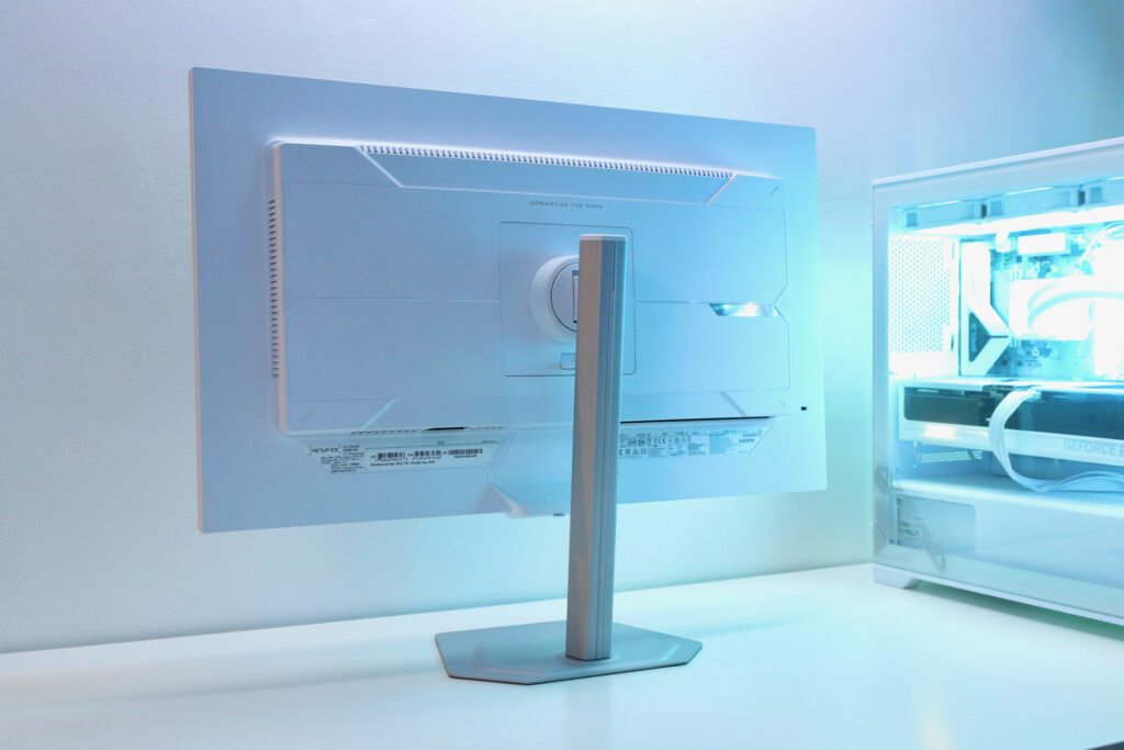 The metal stand with its 2mm base enables more desk space and provides a more minimalist look to the set up. You also get 130mm of height adjustment, tilt, and swivel. From the sides, it’s not a slim monitor, but it still looks good and features four-sided passive ventilation, meaning there’s no fans so it’s quiet and doesn’t sound like a hair dryer during marathon gaming sessions.
